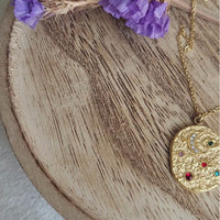 Channel your inner cosmic goddess with this stunning 18K gold-plated coin pendant necklace. Featuring a starry sky, moon, sun, and an eye, it sparkles with multicolor cubic zirconia stones for an otherworldly touch. Perfect for adding celestial charm to your everyday look, this necklace is your connection to the cosmos, radiating magic and beauty wherever you go. ✨🌙🌟